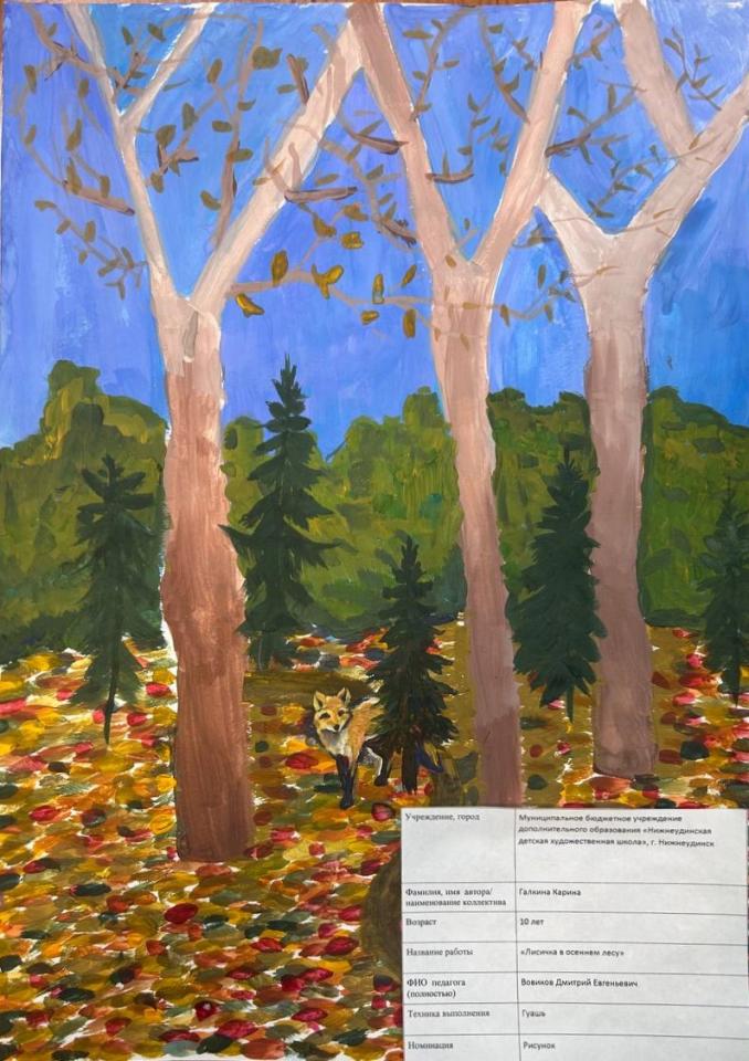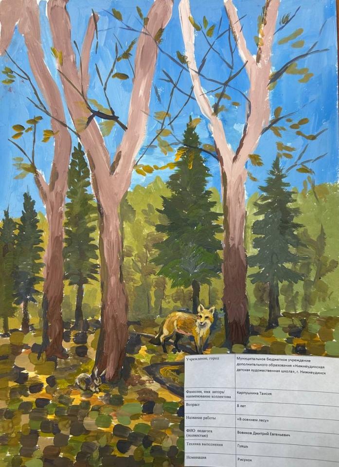 | 27 | Карпушкина Таисия | В обработке | "В осеннем лесу" | Рисунок | Вовиков Дмитрий Евгеньевич | Принята | Фото работы |