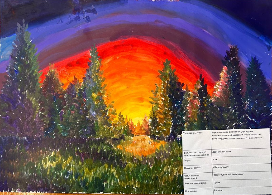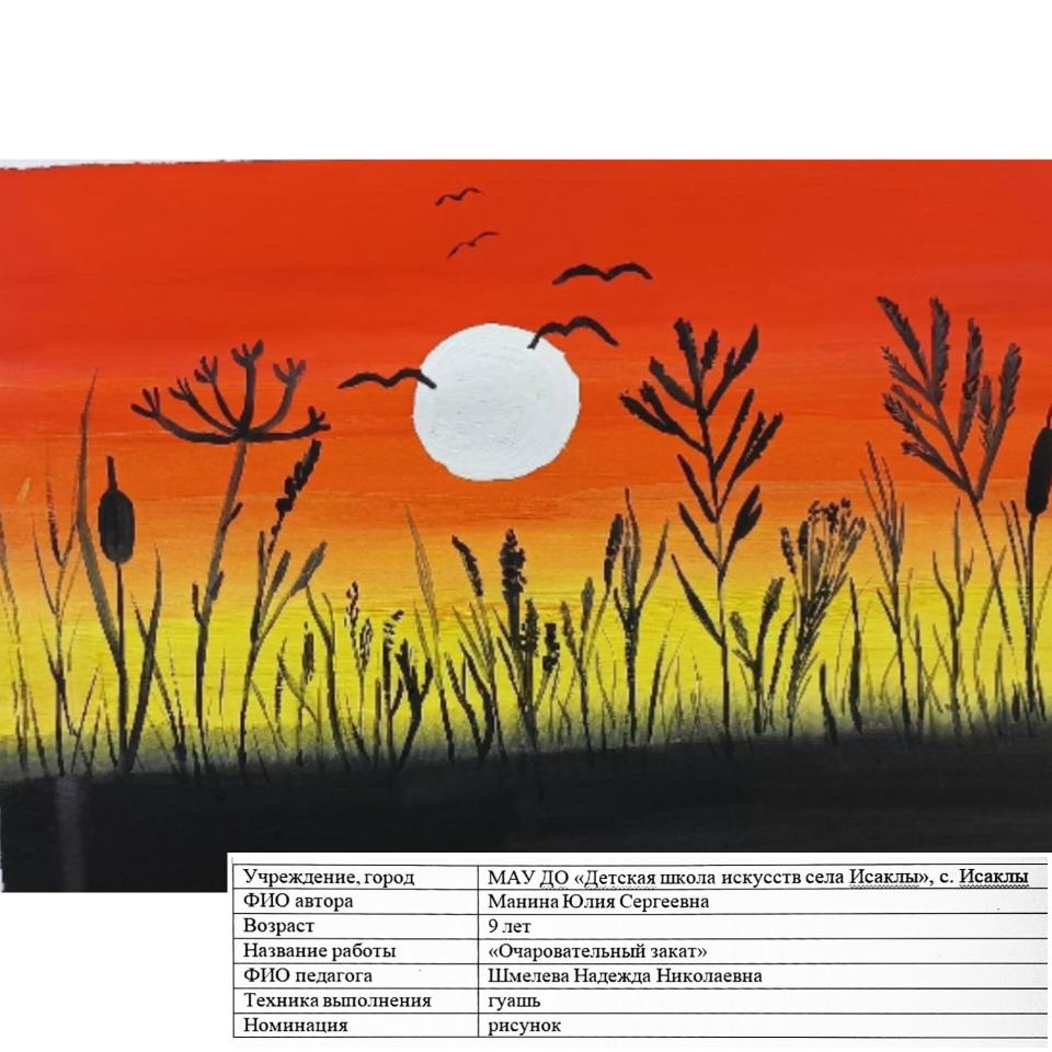 | 54 | Манина Юлия | В обработке | "Очаровательный закат" | Рисунок | Шмелева Надежда Николаевна | Принята | Фото работы |