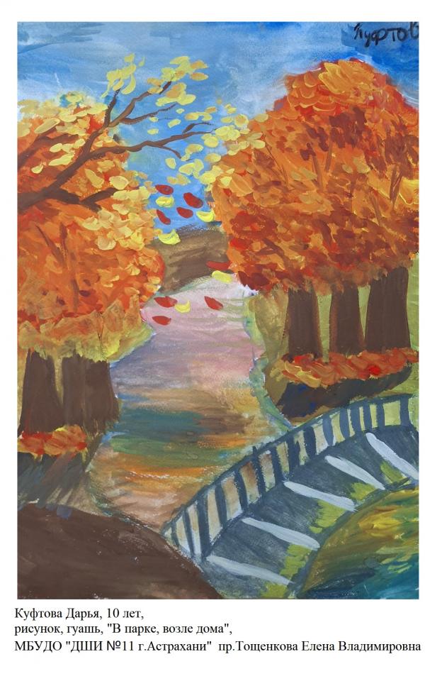 | 119 | Куфтова Дарья | В обработке | "В парке, возле дома" | Рисунок | Тощенкова Елена Владимировна | Принята | Фото работы |