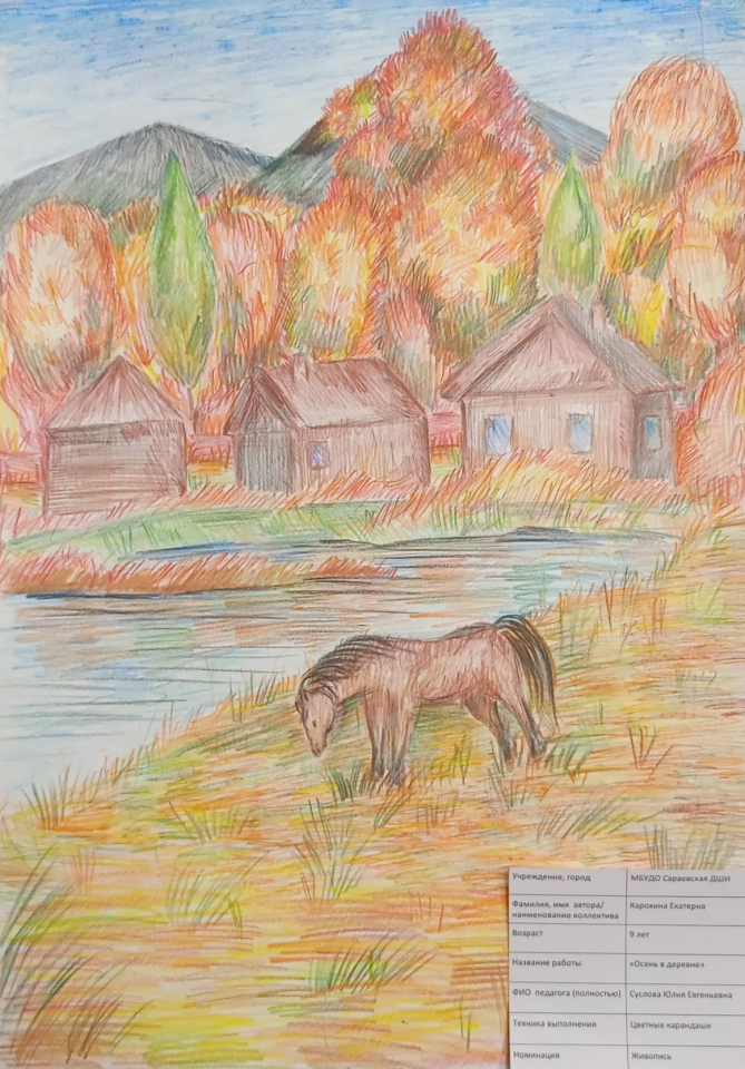 | 51 | Карохина Екатерина | В обработке | "Осень в деревне" | Рисунок | Суслова Юлия Евгеньевна | Принята | Фото работы |