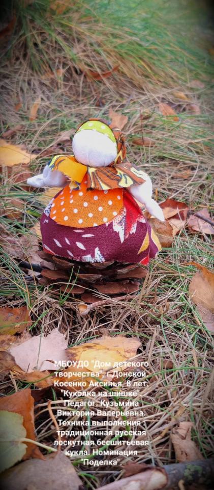 | 109 | Косенко Аксинья | В обработке | "Куколка на шишке" | Поделка | Кузьмина Викория Валерьевна | Принята | Фото работы |