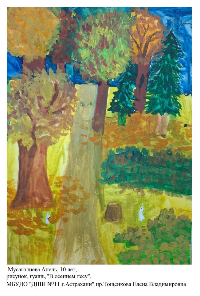 | 120 | Мусагалиева Анель | В обработке | "В осеннем лесу" | Рисунок | Тощенкова Елена Владимировна | Принята | Фото работы |