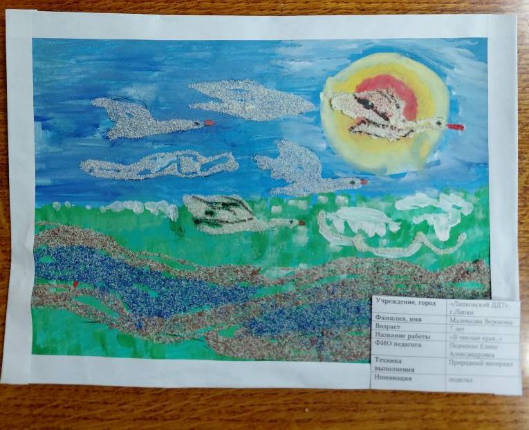 | 14 | Маленкова Вероника | В обработке | "В теплые края" | Поделка | Педченко Е.А. | Принята | Фото работы |