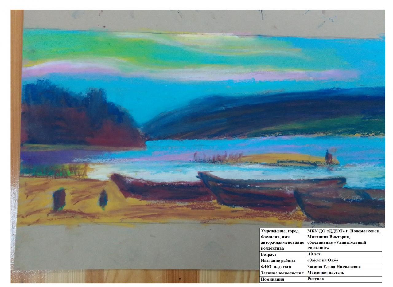 | 55 | Митянина Виктория | В обработке | "Закат на Оке" | Рисунок | Зюзина Елена Николаевна | Принята | Фото работы |