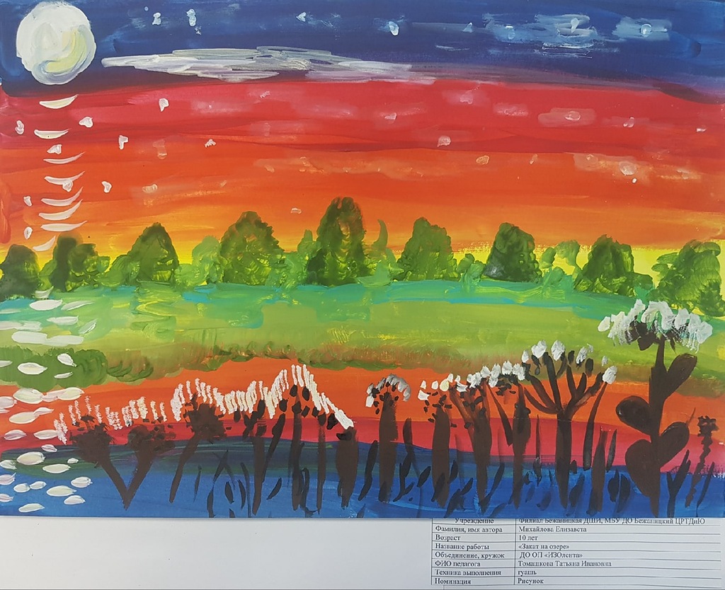 | 104 | Михайлова Елизавета | В обработке | "Закат на озере" | Рисунок | Томашкова Татьяна Ивановна | Принята | Фото работы |