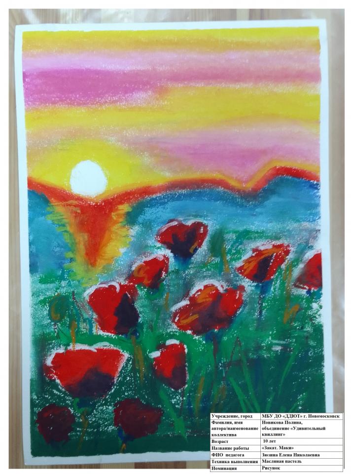 | 56 | Новикова Полина | В обработке | "Закат. Маки" | Рисунок | Зюзина Елена Николаевна | Принята | Фото работы |