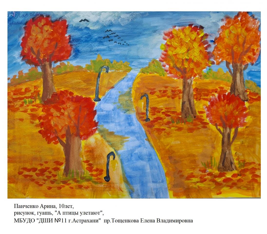 | 123 | Панченко Арина | В обработке | "А птицы улетают" | Рисунок | Тощенкова Елена Владимировна | Принята | Фото работы |
