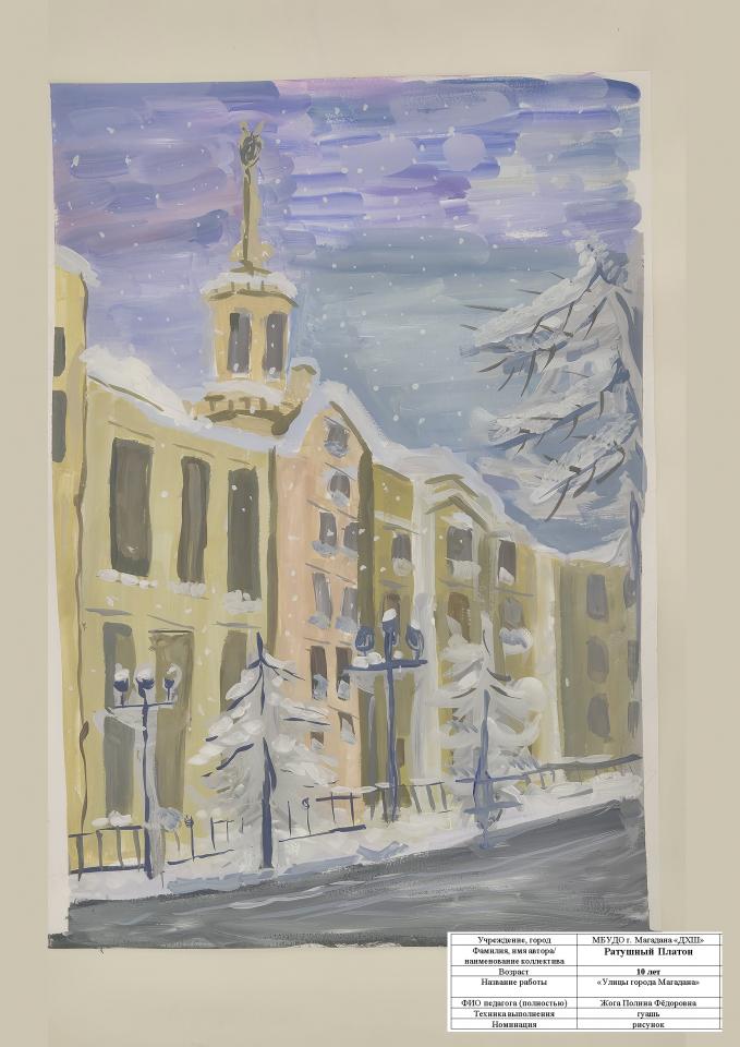 | 35 | Ратушный Платон | В обработке | "Улицы города Магадана" | Рисунок | Жога Полина Фёдоровна | Принята | Фото работы |