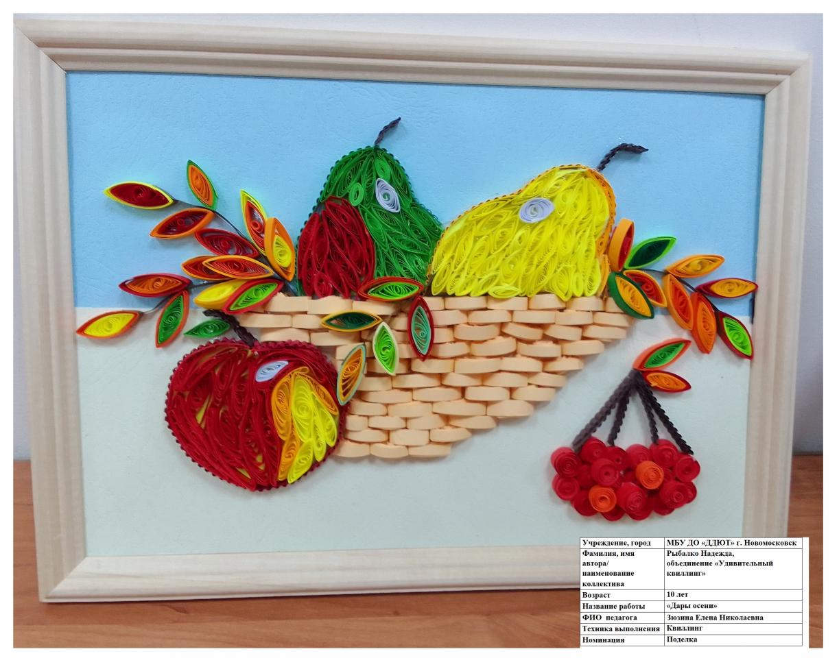 | 57 | Рыбалко Надежда | В обработке | "Дары осени" | Поделка | Зюзина Елена Николаевна | Принята | Фото работы |