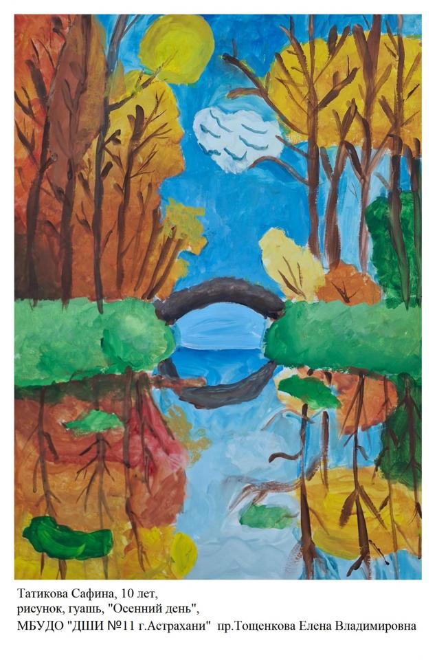 | 122 | Татикова Сафина | В обработке | "Осенний день" | Рисунок | Тощенкова Елена Владимировна | Принята | Фото работы |