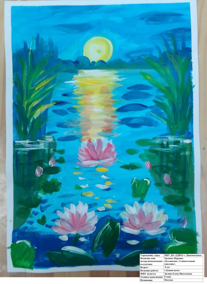 | 58 | Трунова Марьяна | В обработке | "Лунная ночь" | Рисунок | Зюзина Елена Николаевна | Принята | Фото работы |