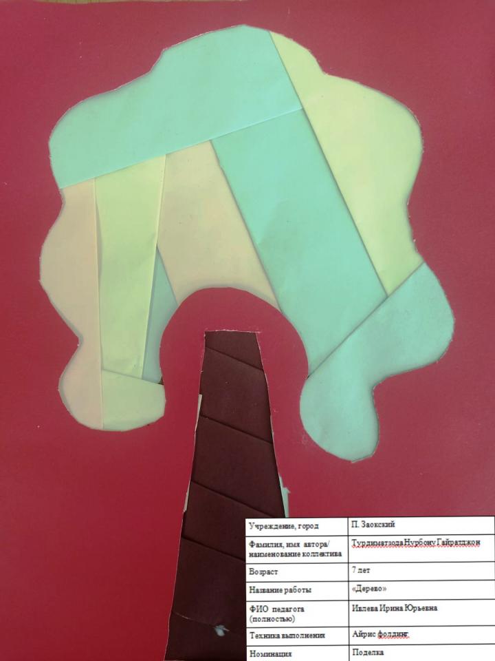 | 112 | Турдиматзода Нурбону | В обработке | "Дерево" | Поделка | Ивлева Ирина Юрьевна | Принята | Фото работы |