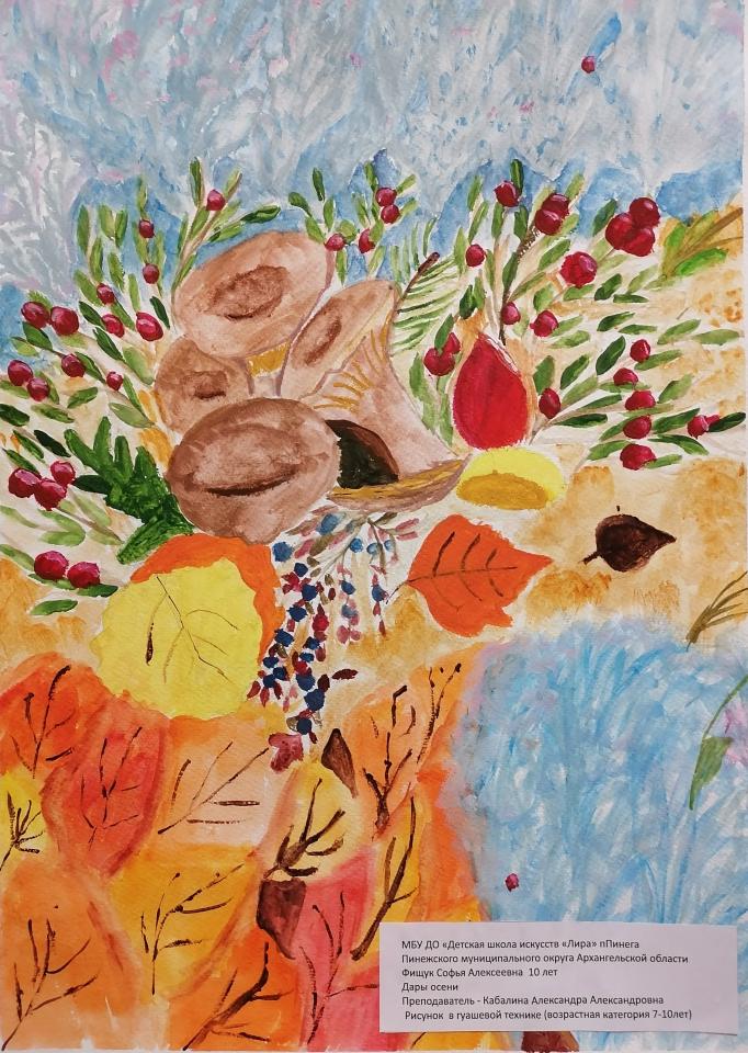 | 95 | Фищук Софья | В обработке | "Дары осени" | Рисунок | Кабалина Александра Александровна | Принята | Фото работы |