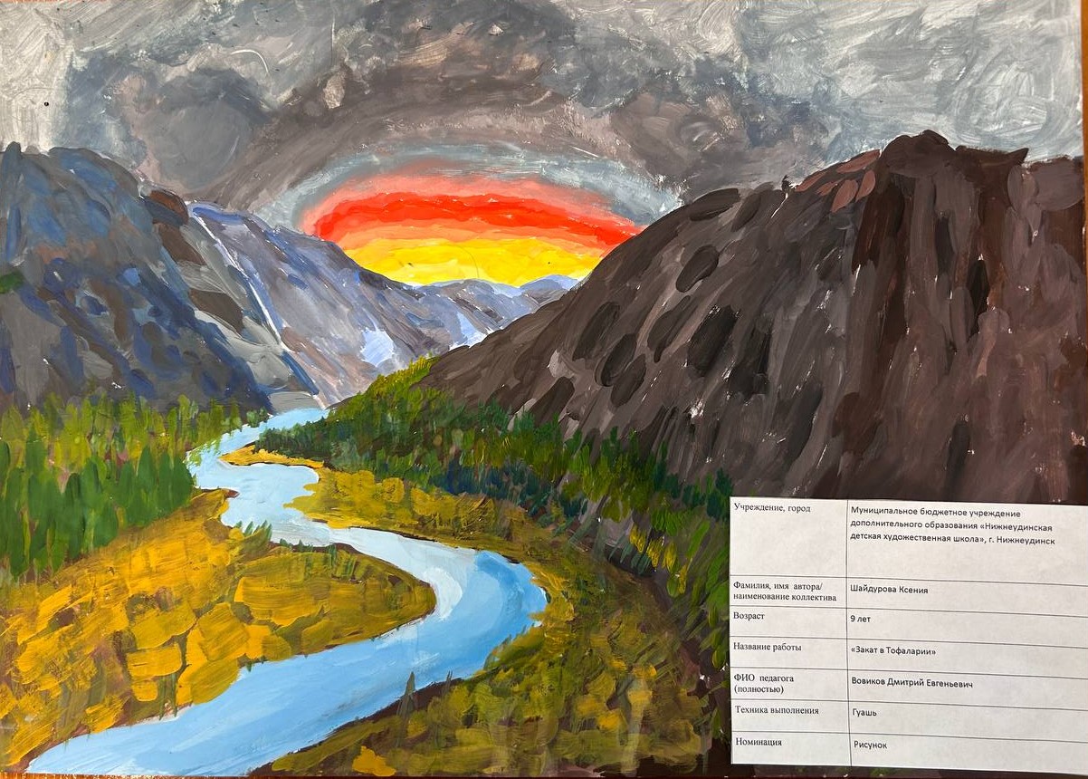 | 28 | Шайдурова Ксения | В обработке | "Закат в Тофалари" | Рисунок | Вовиков Дмитрий Евгеньевич | Принята | Фото работы |